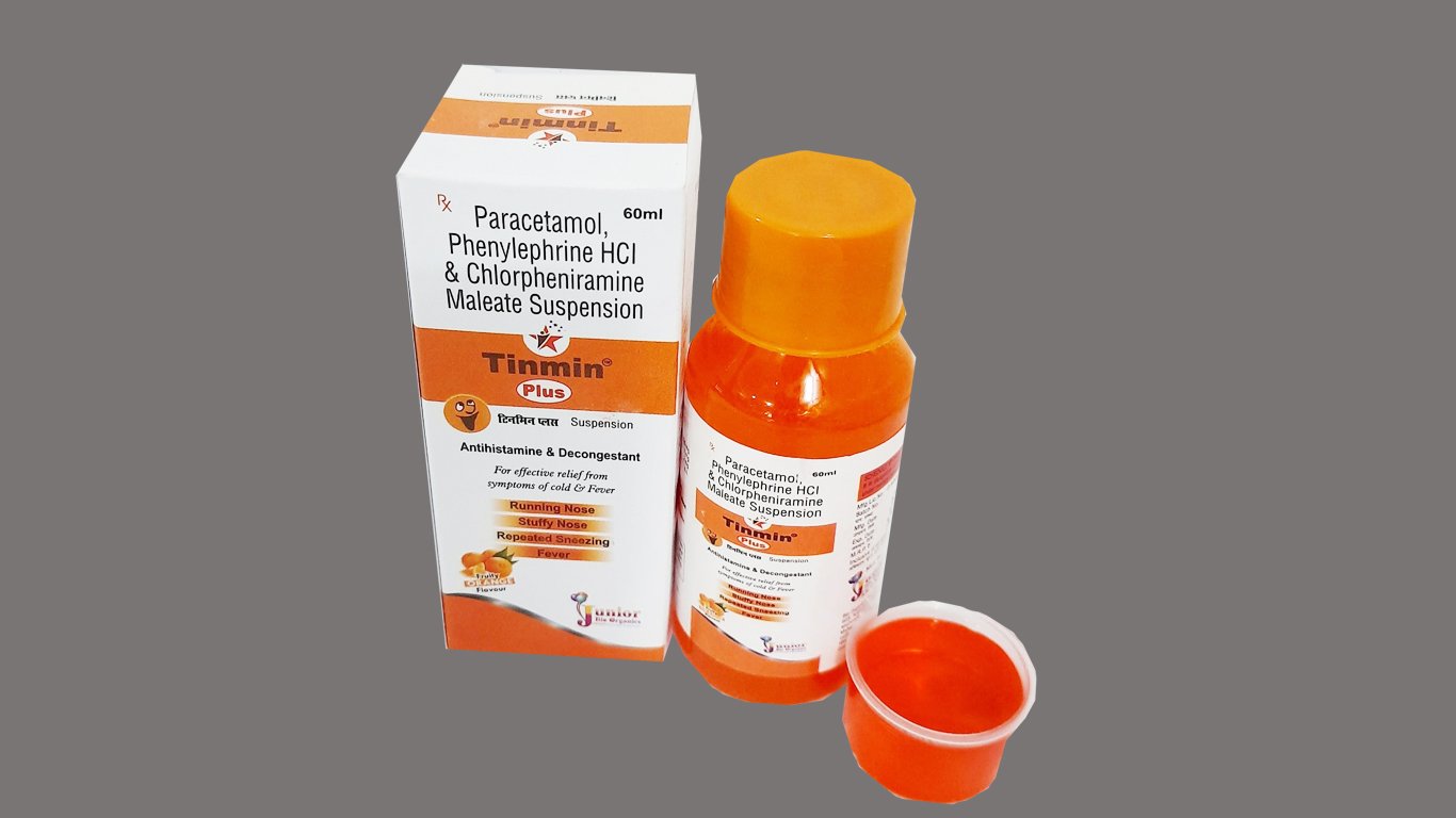 Known for its magical touch with fruity orange flavor . Tinmin Plus is Antipyretic , Antihistamine & Decongestant . Tinmin Plus gives effective relief in just 30 minutes from symptoms of Fever , Common Cold , Running Nose , Stuffy Nose , Repeated Sneezing , Allergic Rhinitis , Sinusitis & other upper respiratory tract disorder . Tinmin Plus is available in Syrup, Drops & tablet form. Composition
